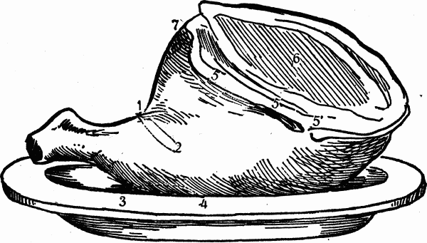 Some very good cuts are taken from the broad end from 5 to 6, and the fat on this ridge is very much liked by many. The cramp-bone is a delicacy, and is obtained by cutting down to the bone at 4, and running the knife under it in a semicircular direction to 3. The nearer the knuckle the drier the meat, but the under side contains the most finely grained meat, from which slices may be cut lengthwise. When sent to the table a frill of paper around the knuckle will improve its appearance.