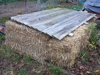 Using straw bales to make a cold frame can be done very quickly and easily. The straw bale cold frame is put together using a double-walled panel of polycarbonate on top of the straw bales. Both materials are good insulators and unlike glass the polycarbonate doesn't break as easily and the ribs between the layers helps diffuse the sunlight evenly.
